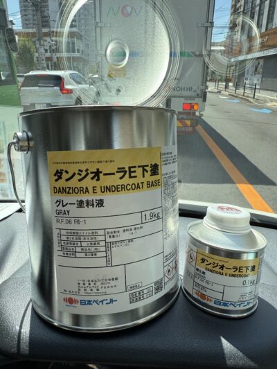 最近、発売された日本ぺイントのサビ止めですがケレンが出来にくい状況でも、優れたサビ止めで膜厚も通常のサビ止めの2倍を確保でき、塩害などにも対応している重防食対応のサビ止め塗料を使用しました。