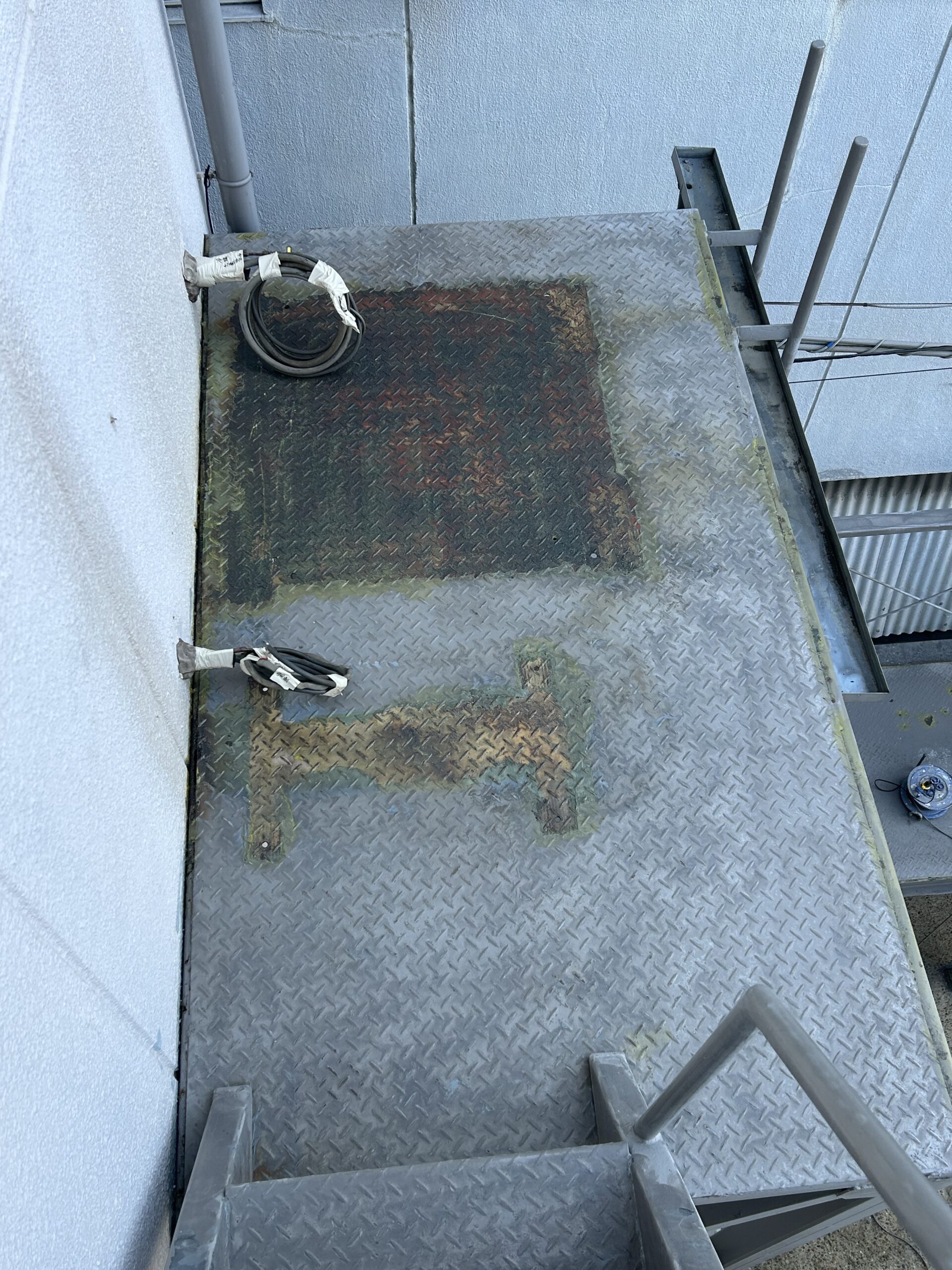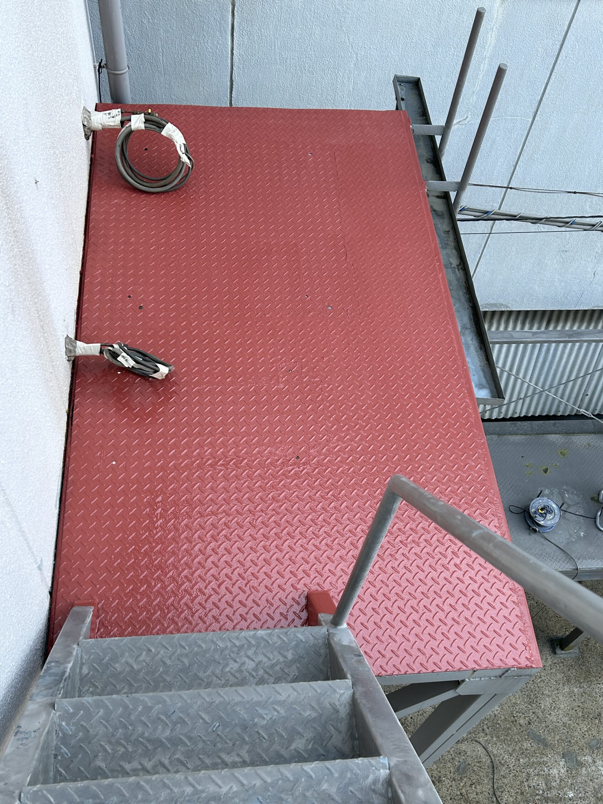 大阪市福島区で外壁ALCの塗り替え現場で、清掃後に鉄板を塗り作業完了致しました。